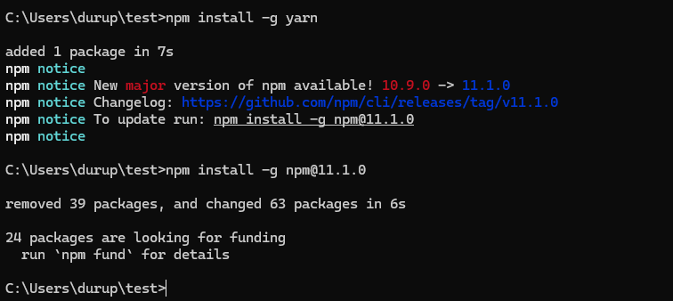 npm install -g npm@11.1.0 으로 최신버전으로 업데이트 한다.