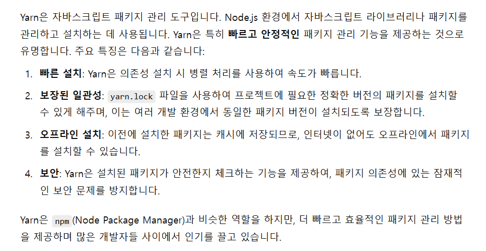 yarn 에 대해서 chatgpt에서 문의하여 위와 같은 답변을 받았다.