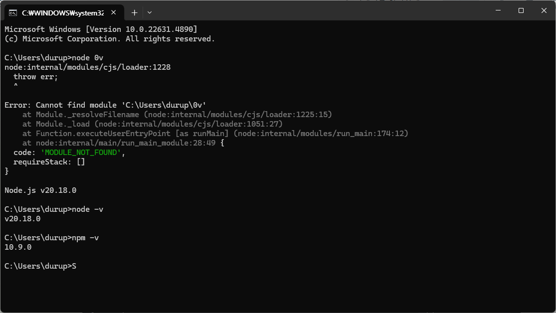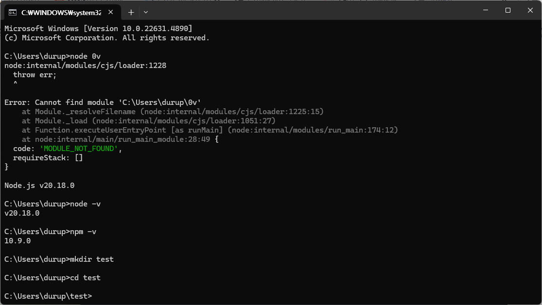 node의 버전은 v20.18.0 이고 npm의 버전은 10.9.0 으로 확인된다.