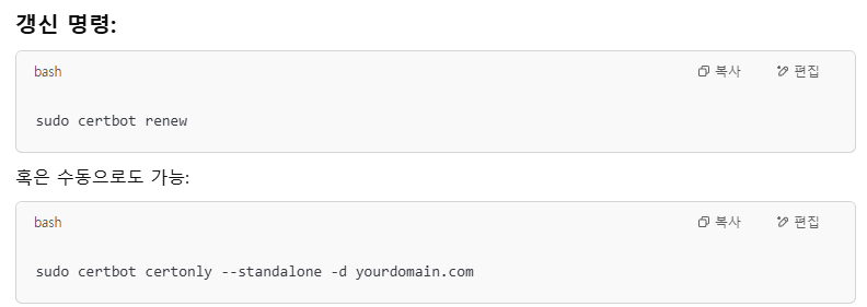 Let's Encrypt 인증서는 90일짜리이므로 주기적으로 갱신해야 합니다.